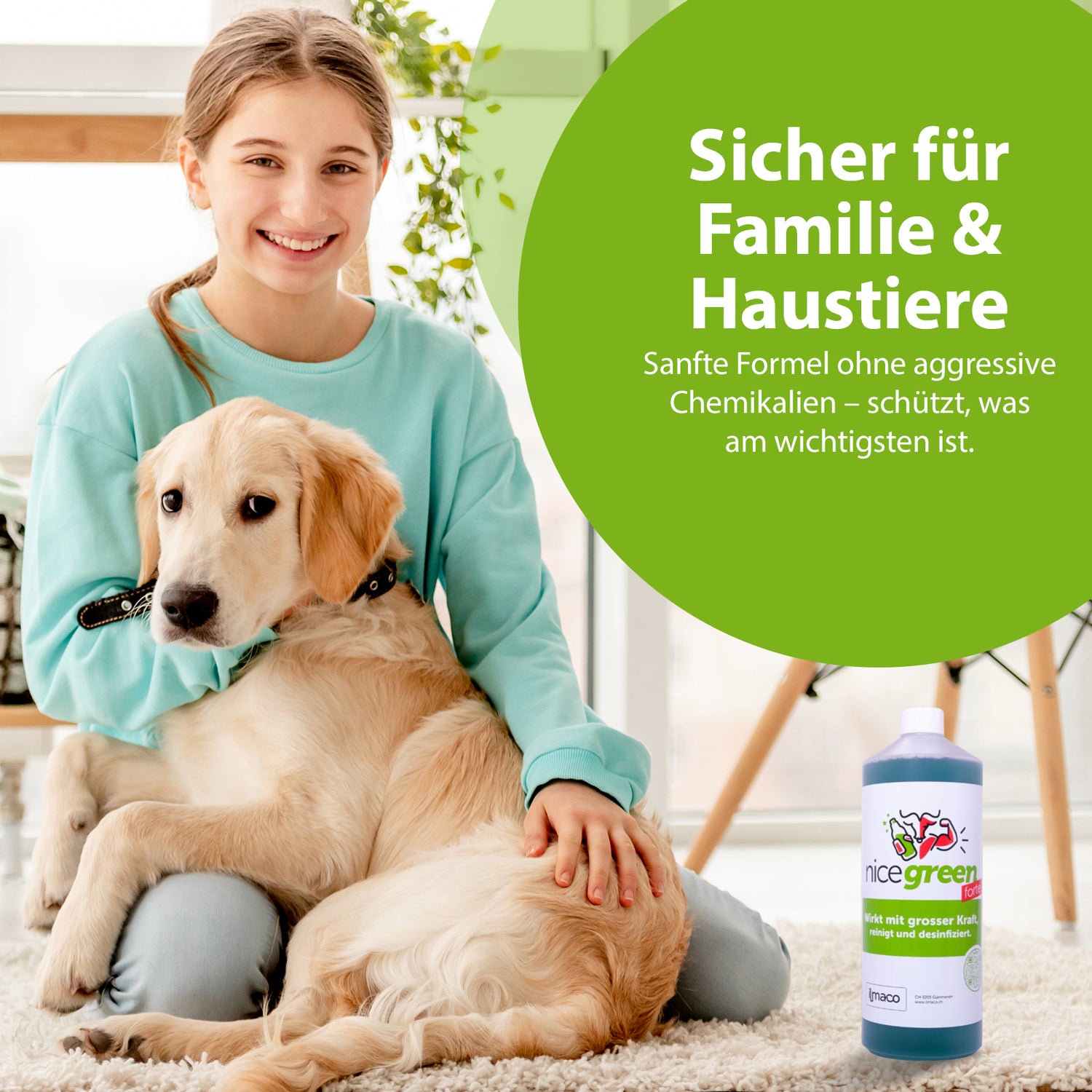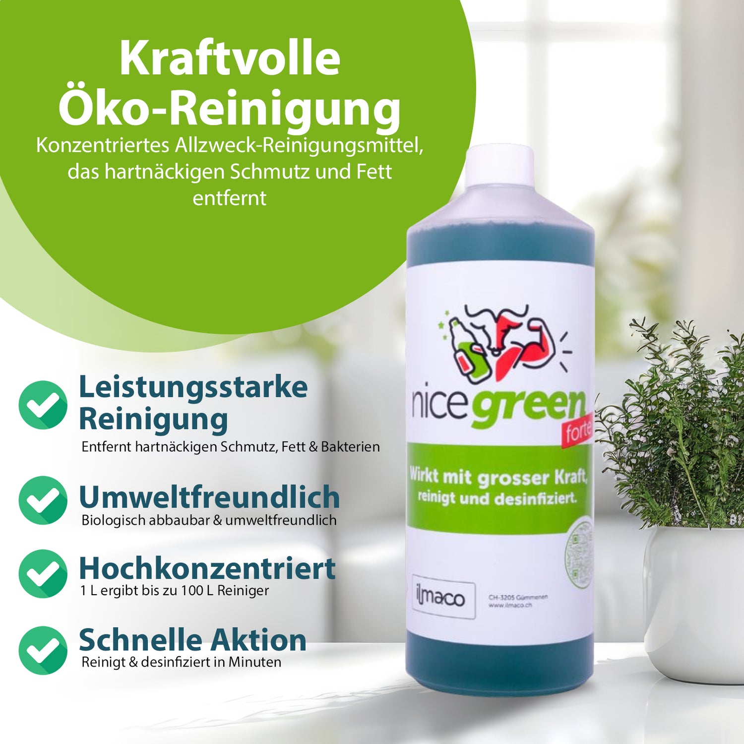 Mit Nicegreen Forte wird Putzen zur Leichtigkeit. Unser hochkonzentrierter Reiniger entfernt selbst hartnäckigen Schmutz, Fett und Flecken im Handumdrehen – und das ganz ohne aggressive Chemikalien.