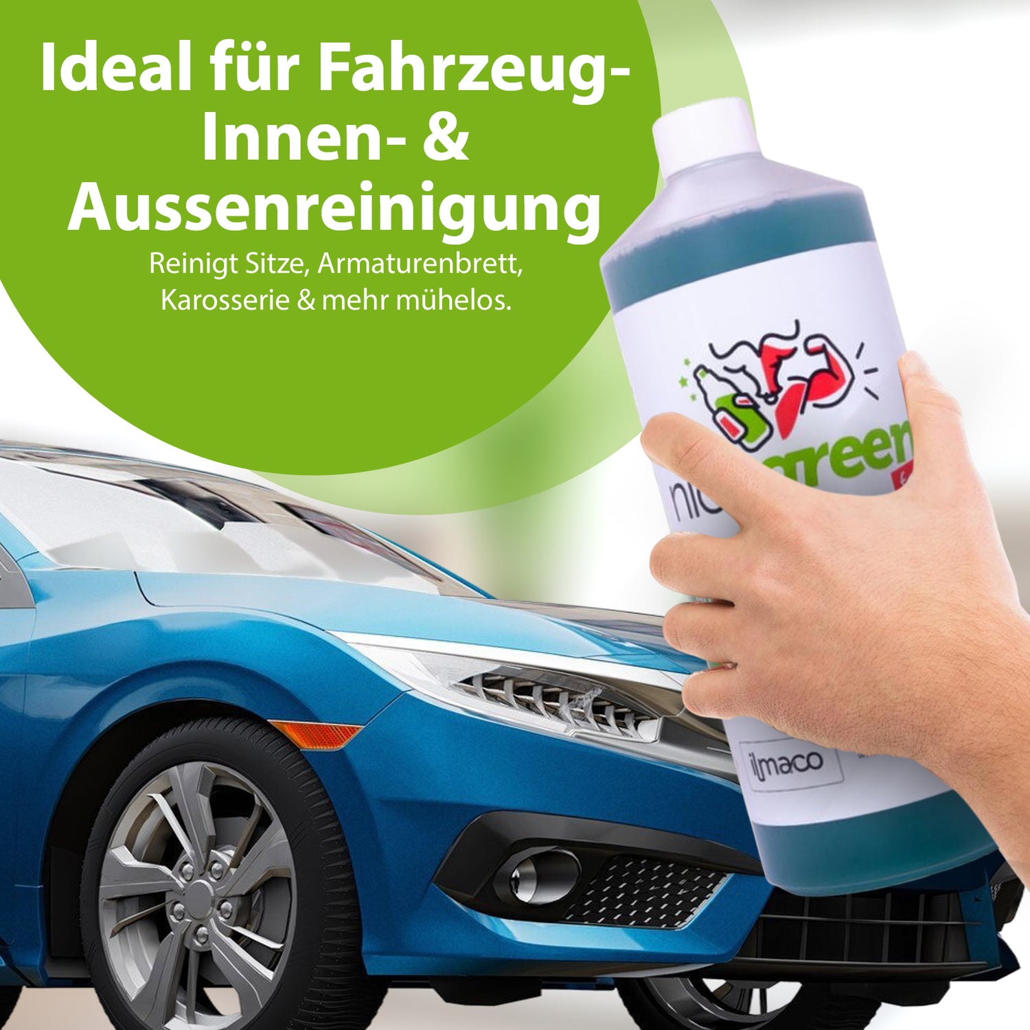Nicegreen Forte – Die Komplettlösung für dein Auto: Innen- und Aussenreinigung, Insektenentfernung und Felgenreinigung – sanft zu Leder, Stoff, Kunststoff und Felgen. Frischer Duft, gepflegtes Interieur, glänzender Lack.